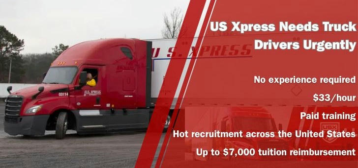 Join US Xpress and you will not only receive a generous salary of up to $33 per hour, but also paid CDL training , housing and transportation support, plus full health benefits, 401(k) retirement savings match, tuition reimbursement and more. You can start with no experience and choose from positions across the United States. Become a truck driver with US Xpress now!
